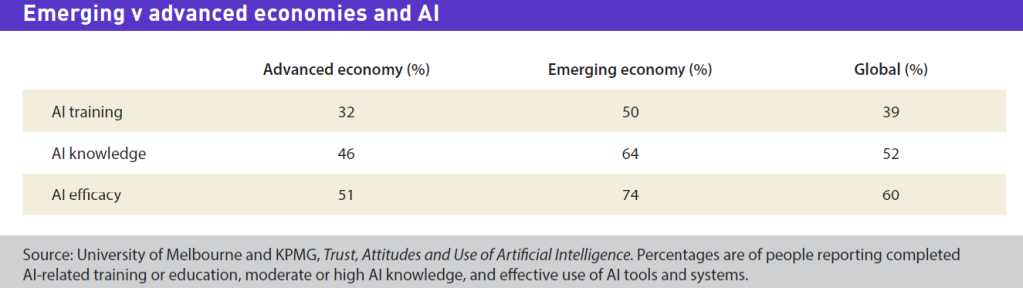 The University of Melbourne and KPMG’s report, Trust, Attitudes and Use of Artificial Intelligence, captured the views of 48,000 people in 47 countries. On four measures, the research found that, compared with those in advanced economies, people generally in emerging economies report higher regular use of AI technology (80% v 58%), training (50% v 32%), knowledge (64% v 46%), and effective use (74% v 51%). Also, the research revealed, employee adoption in the workplace in emerging economies is leading the way, with 72% using AI regularly compared with 49% in advanced economies.