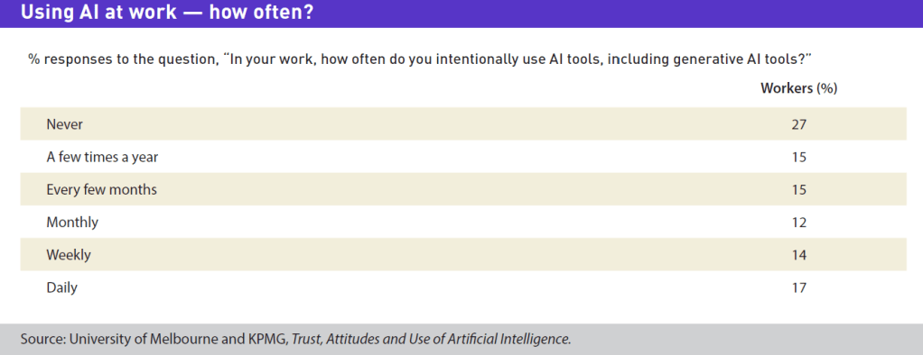 In the workplace, more specifically, the report points to a similar pattern: 58% of employees report intentionally using AI tools and systems regularly in their work. Yet less than half (47%) of employees report any form of training or education in AI or related fields. Only 46% of workers say they have at least a moderate level of AI knowledge, and only 51% believe they can use AI effectively.