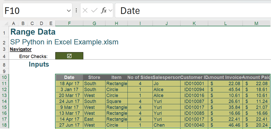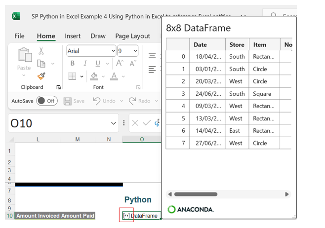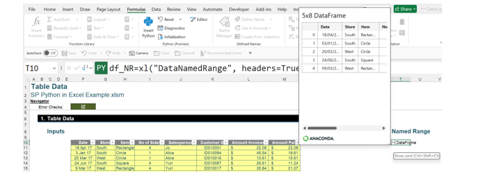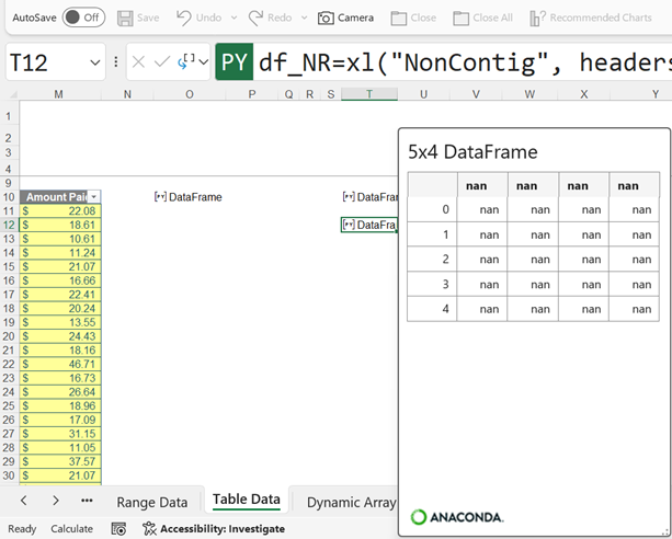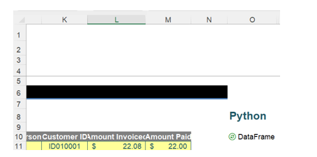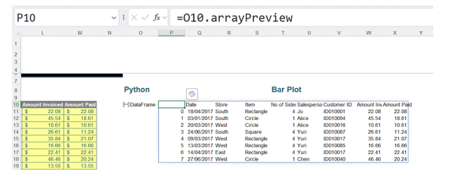 The Python objects are recalculated when any of the underlying data is changed (see more about this below). Therefore, by changing data in the range F10:M18 in the current example, it is possible to see the DataFrame df_range refreshing. Below, Amount Paid in cell M11 has been changed from $22.08 to $22.00. Note the refresh icon: