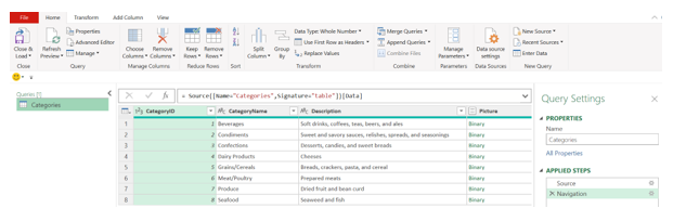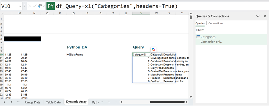 This applies to all the Excel entities accessed in DataFrames. Queries created in Power Query may also be used as data sources for Python. This query will be used as a source for the next Python example: