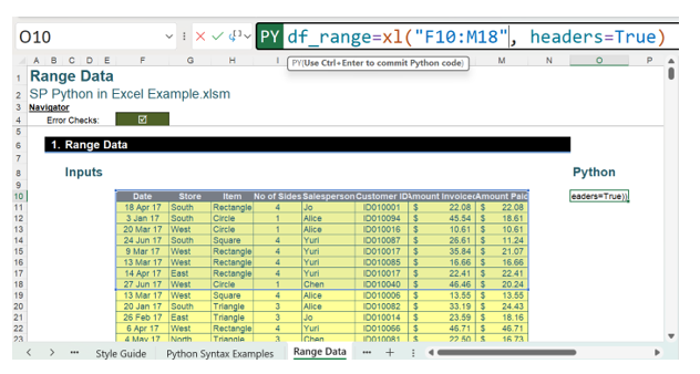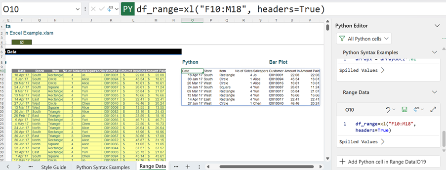 Note that, although for this example the Python formula accesses Excel data in the same sheet, data from other sheets may be extracted: