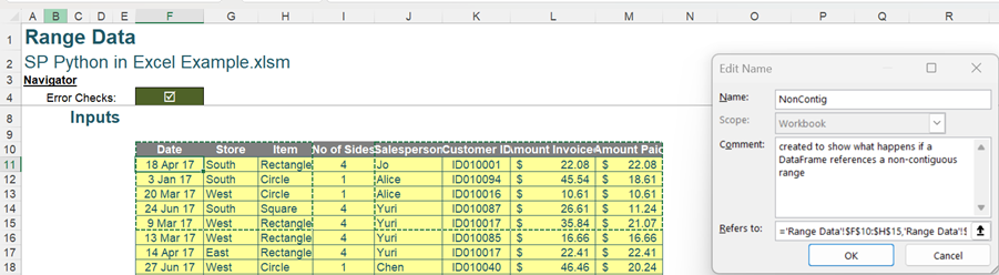 In earlier releases of Python in Excel, this caused an Excel resources error, but now this may appear to be a way to reference noncontiguous ranges in DataFrames. However, if the Excel Value view is used: