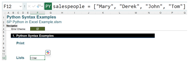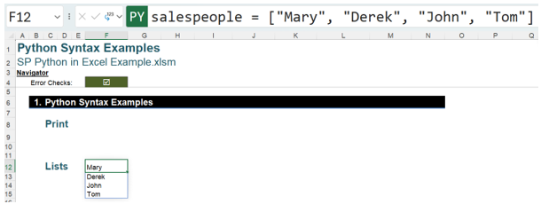 Note that the variable identifying the list, salespeople, is not shown. This identifier may be referenced in other Python code. For example, the code to show the list with an extra employee will be entered in cell H12. The Excel Value view has been selected for F12 and H12 to make it easier to follow:
