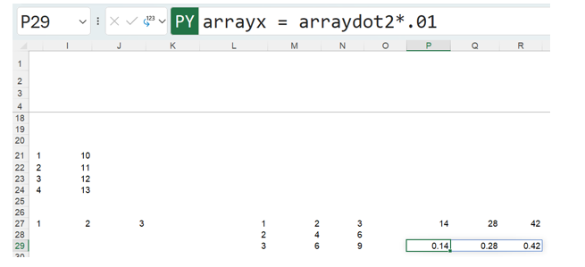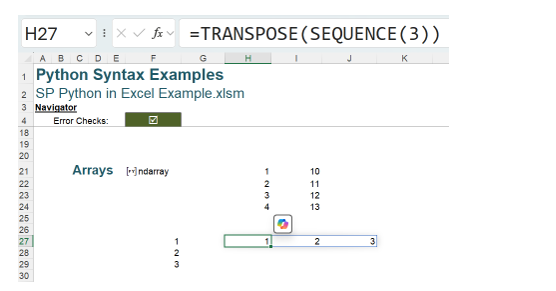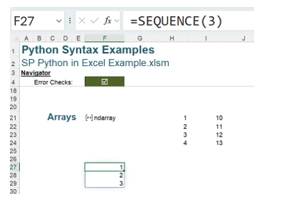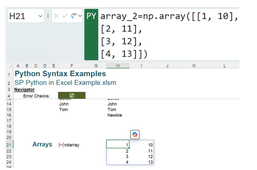 The NumPy library allows operations on matrices to be performed. Two very simple dynamic arrays will be created. The first is created using the Excel dynamic array formula: