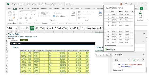 Ranges of data have been selected by specifying cell references so far, but Python can also read all data from an Excel Table. The Table on the Table Data sheet is named DataTable: