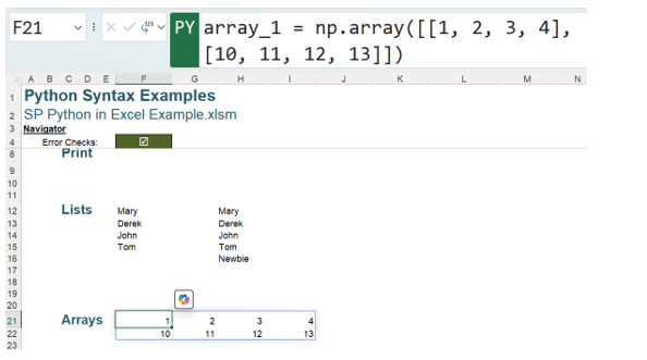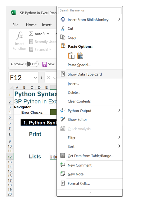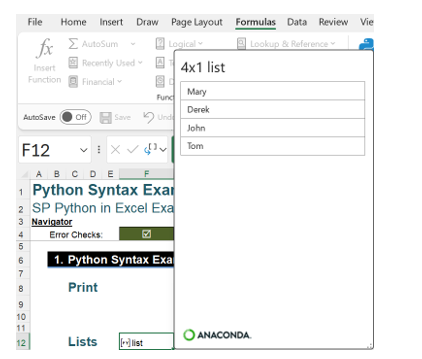 - Working with lists: When using Python in Excel to analyse data, one of the simplest ways of storing data is in a list. This section highlights some of the key items to consider.
