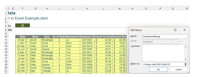 A named range may contain a range of cells. A named range DataNamedRange has been created for cells F10:M15 below.