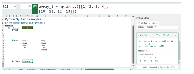 The Python library NumPy allows arrays to be defined. It is preinstalled in the Excel frontend and has the short name np. The next image shows a simple 4×2 (four columns by two rows) array in the Excel Value view: