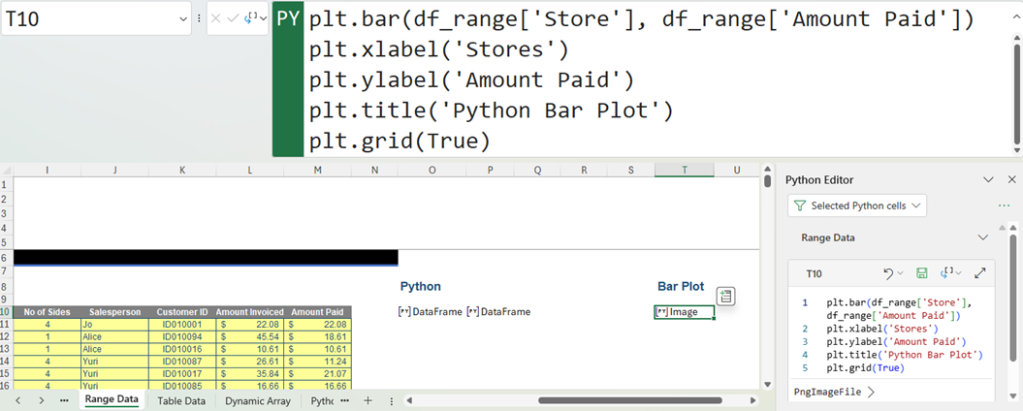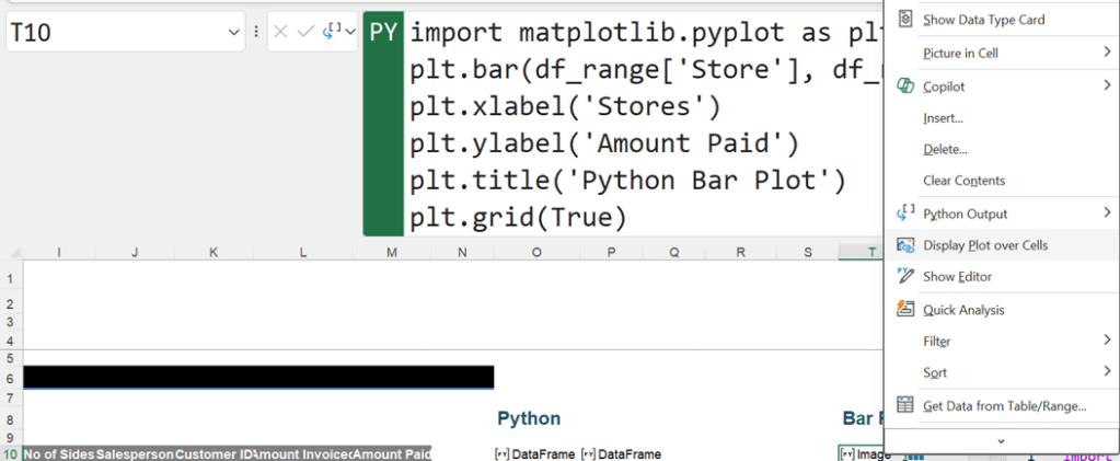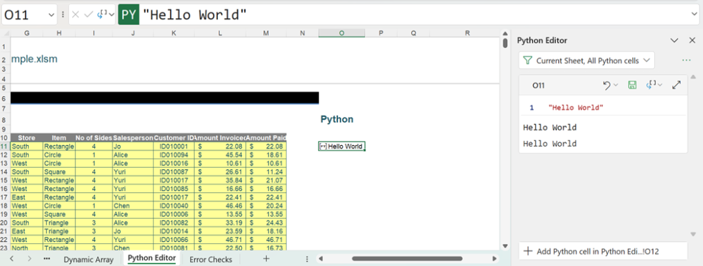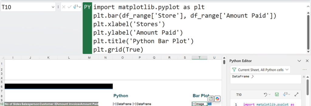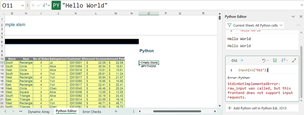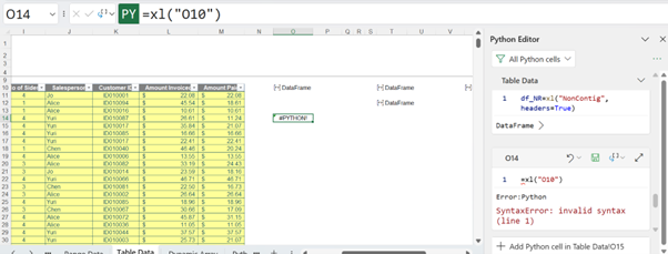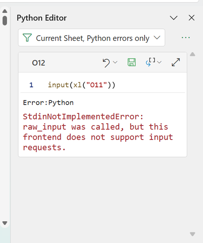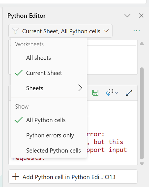 This is the same error as the one encountered in the Formula bar method of creation. We are currently filtering by current worksheet, but there are other ways to filter the cells shown in the Python Editor tab: