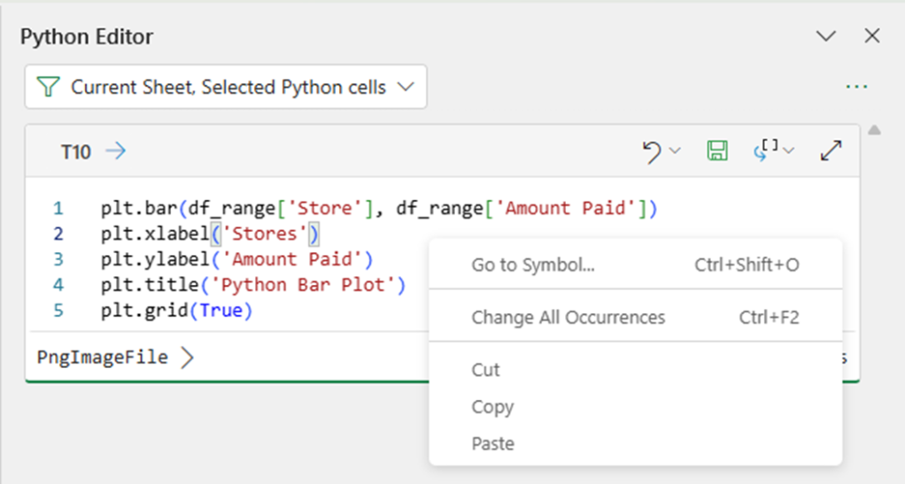 The display is the same for either the Python Object or Excel Values view, as that only applies to the grid. There is a right-click menu available for each cell of Python code in the Python Editor: