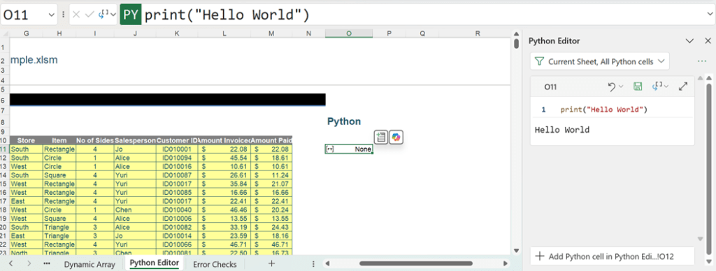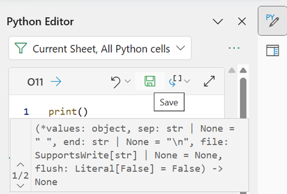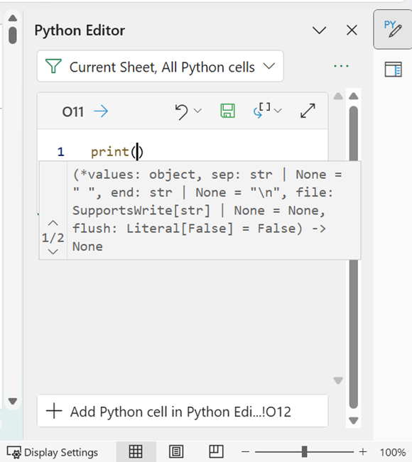 Note that since the code is entered into the editor, the equals (=) sign needed in the Formula bar is not required here. To begin entering code into cell O11, we enter “print(” (this will automatically be “completed” with the closed bracket as well):