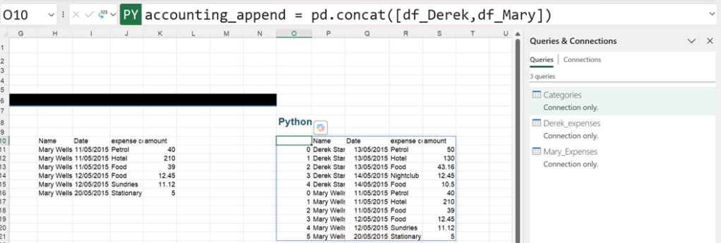 - edit_accounting_append = pd.concat([xl(“Derek_expenses”),xl(“Mary_Expenses”)])
