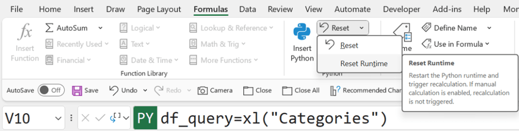 If the #BUSY! error displays for longer than a minute, Microsoft recommends resetting the Python runtime. To do this, on the Formulas tab, select Python and then Reset Runtime (keyboard shortcut CTRL+ALT+SHIFT+F9).