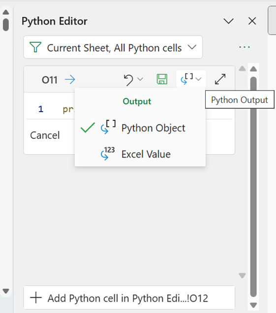 The Output dropdown allows the choice between the Python Object and the Excel Value as shown below: