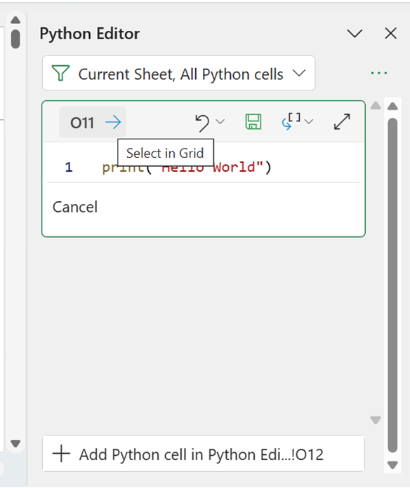 Although the examples so far have used the Formula bar, it is also possible to enter Python code into the cell using the Python Editor. If the Python Editor is accessed in a sheet with no Python cells, and the filter is set to show Current Sheet, All Python cells, there will only be the option to enter code into the currently selected cell:
