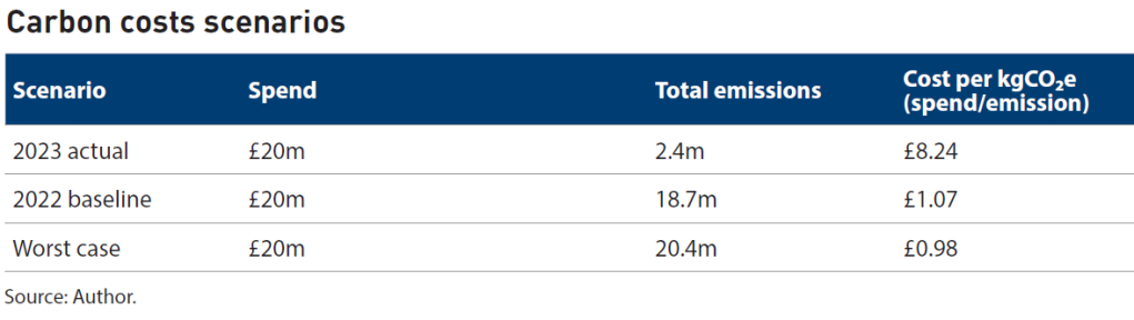 When the same ยฃ20 million spend is divided by a much smaller carbon footprint, the average cost per kgCOโe rises from ยฃ1.07 in 2022 to ยฃ8.24 in 2023 (see the table “Carbon Costs Scenarios”). This is the same average measure we referred to earlier, and it illustrates why that measure can be misleading. At first glance it could be mistaken for a higher cost of emissions. In reality, it signals improvement. The business is spending the same amount to operate as in 2022 but is producing far fewer emissions in 2023. A higher average cost per kgCOโe is therefore evidence of cleaner operations, not inefficiency.