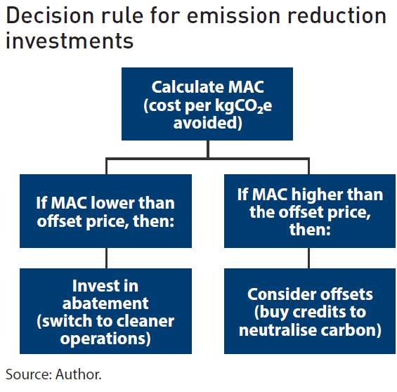 The MAC for switching from diesel to HVO is ยฃ0.11 per kgCOโe, compared with the offset benchmark of ยฃ0.18. Since ยฃ0.11 is lower, HVO is cheaper than buying carbon offsets. It also avoids reputational risk because stakeholders identify cutting emissions at source as a far more proactive step than relying on offsets. The decision rule that helps managers decide whether to abate emissions or purchase offsets is shown in the flow chart “Decision Rule for Emission Reduction Investments”.