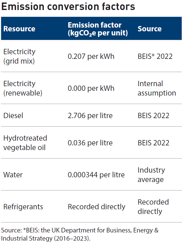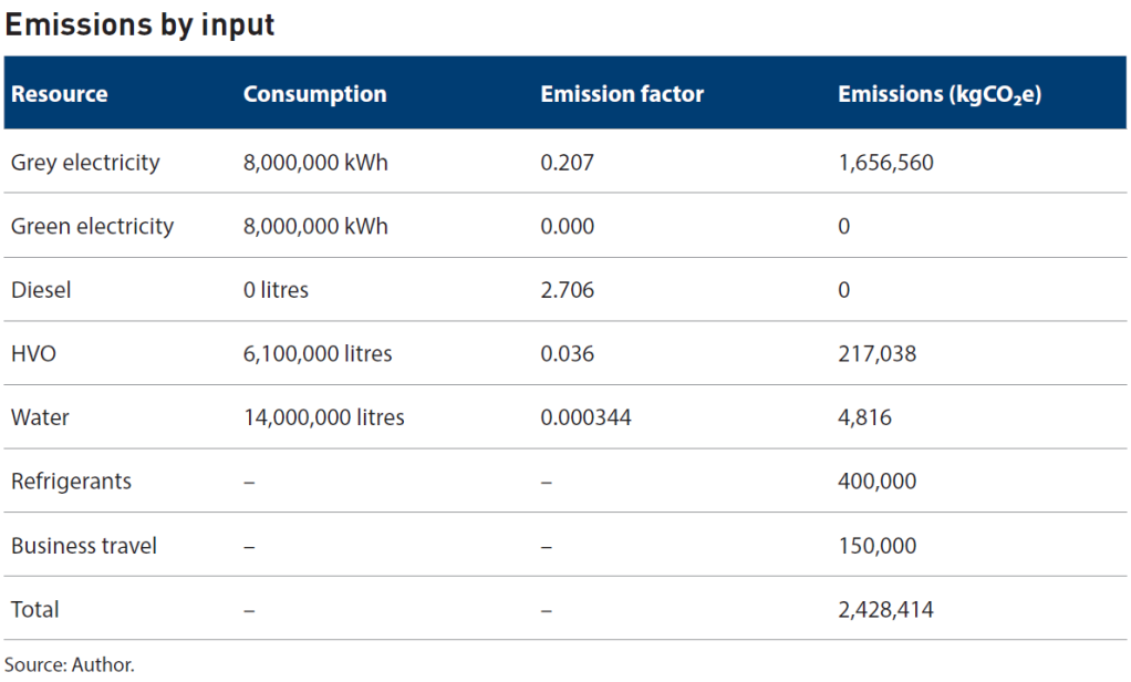The next step was to track the inputs that drive emissions. The focus was on four main categories of operating expenditure: electricity, fuel in the form of diesel and hydrotreated vegetable oil (HVO), water, and refrigerants. Each input has a measurable physical unit such as kilowatt hours, litres, cubic metres, or kilograms.