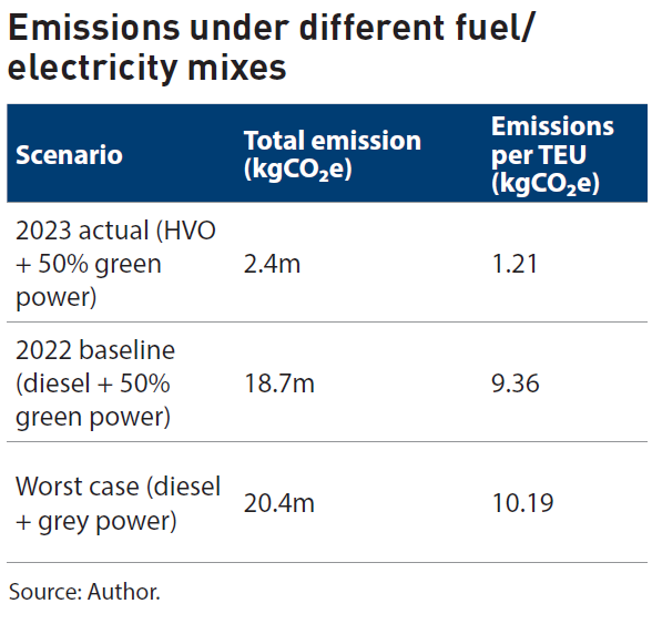 Emissions under different fuel and electricity mixes are shown in the table “Emissions Under Different Fuel/Electricity Mixes”. In 2023, switching entirely to HVO and sourcing half of the port’s electricity from renewables reduced total emissions to 2.4 million kgCOโe (1.21 kgCOโe per TEU). By contrast, the 2022 baseline using diesel (instead of HVO) with the same electricity mix produced 18.7 million kgCOโe (9.36 kgCOโe per TEU). A worst-case reliance on diesel and grey electricity would have pushed emissions to 20.4 million kgCOโe (10.19 kgCOโe per TEU). Overall, the 2023 changes cut emissions by about 88% compared with the previous worst-case scenario.