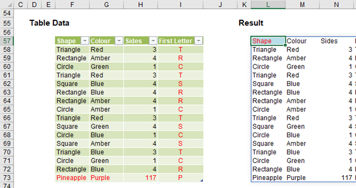 However, once you have a Dynamic Array, referring to it is simple using what is known as the Spilled Range Operator. For example, if I want to refer to the Dynamic Array in the previous examples, it initially had a range of L57:N72. However, once I had added a row and column to the Table, this resized to L57:O73. I can easily refer to this array, whatever its size, as follows: